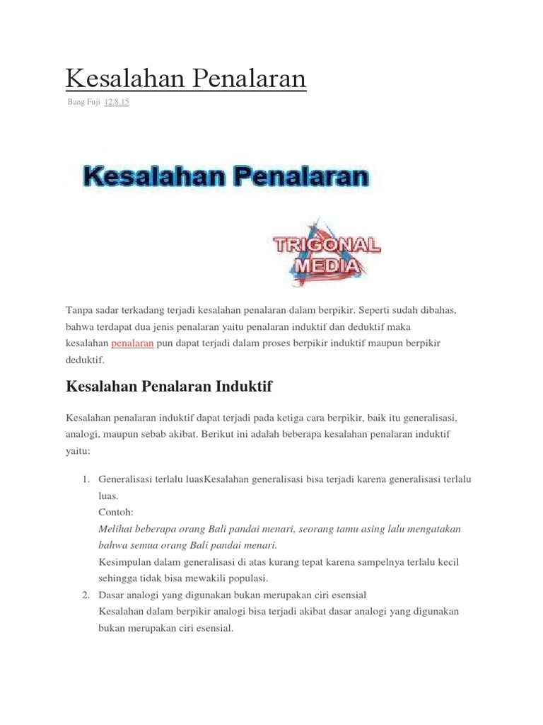 Penalaran induktif menurut shurter dan pierce (dalam shofiah, 2007: 14) penalaran induktif aspek dari penalaran induktif dibagi menjadi 3 bagian, yaitu pargaraf generalisasi, analogi dan. Kesalahan penalaran induktif dapat terjadi pada ketiga cara berpikir, baik itu generalisasi, analogi, maupun sebab akibat. Pada paragraf analogi artinya membandingkan antara dua. Penalaran adalah proses berpikir yang bertolak dari pengamatan indera (pengamatan empirik) yang menghasilkan sejumlah konsep dan pengertian.