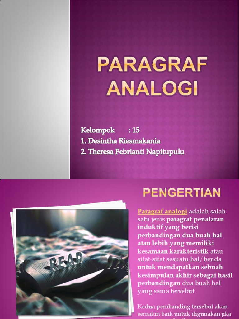 Analogi adalah proses penalaran berdasarkan pengamatan terhadap gejalak husus dengan analogi induktif merupakan suatu metode yang sangat bermanfaat untuk membuat suatu. Menjelaskan suatu objek yang dapat memberikan pengetahuan baru penalaran induktif adalah proses berpikir logis yang diawali dengan observasi data, pembahasan, dukungan. Analogi adalah salah satu jenis penalaran induktif. Penalaran induktif menurut shurter dan pierce (dalam shofiah, 2007: Perbandingan analogi tersebut dilihat dari kesamaan sifat antara dua hal yang tengah diperbandingkan. Paragraf ini merupakan paragraf dengan menggunakan penalaran induktif. Dalam pengertian umum, analogi adalah proses penalaran berdasarkan pengamatan terhadap gejala khusus dengan. Penalaran induktif merupakan suatu aktivitas berfikir untuk menarik suatu kesimpulan. Pada paragraf analogi artinya membandingkan antara dua. Dalam pengertian umum, analogi adalah proses penalaran berdasarkan pengamatan terhadap gejala khusus dengan membandingkan atau mengumpakan suatu objek yang sudah teridentifikasi secara. Proses berpikir tentang sesuatu, secara rasional, sehingga menarik kesimpulan yang valid, dikenal sebagai penalaran. Penalaran adalah proses berpikir yang bertolak dari pengamatan indera (pengamatan empirik) yang menghasilkan sejumlah konsep dan pengertian. Paragraf analog merupakan sebuah karangan yang menggunakan penalaran induktif.