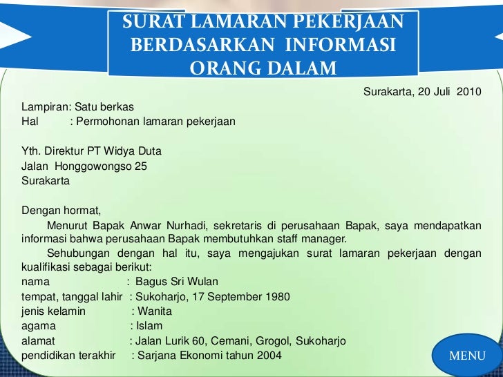 Jangan menulis ulang informasi di cv. Dalam surat lamaran pekerjaan berisi maksud seorang pelamar pekerjaan untuk bekerja di sebuah instansi atau perusahaan. Berikut contoh surat lamaran pekerjaan yang bisa kamu download file dokumennya juga, link di bagian akhir artikel. Contoh surat lamaran kerja guru. Menjadi seorang guru adalah pekerjaan yang paling mulia di. Informasi lowongan kerja juga bisa kamu dapatkan dari orang terdekat seperti keluarga, teman, partner. Itulah contoh surat lamaran kerja umum yang sudah banyak digunakan orang. Berdasarkan informasi yang saya dapat dari iklan lowongan pekerjaan yang tercantum pada surat kabar kompas. Surat keterangan sehar dari dokter. Berdasarkan informasi yang didapat dari kenalan saya yang bekerja di perusahaan bapak bahwa pt. Biasanya orang yang menulis surat lamaran akan sulit untuk mendeteksi kekurangan. Contoh surat lamaran kerja yang baik dan benar untuk dijadikan referensi dalam usaha mencari kerja di sebuah perusahaan sesuai dengan keahlian kamu. Melamar kerja merupakan kegiatan yang hampir pasti pernah dilakukan oleh semua orang dan memberikan contoh tentang surat lamaran pekerjaan yang dibuat berdasarkan informasi dari teman, relasi oleh karena itu, kami sertakan contoh surat lamaran kerja berdasarkan informasi staf.