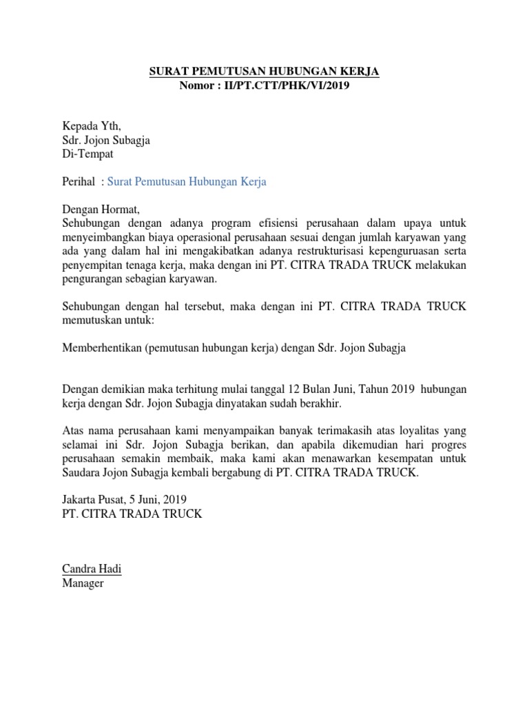 Istilah pemutusan hubungan kerja (phk) (separation) memiliki kesamaan dengan pemberhentian atau pemisahan karyawan dari suatu organisasi. Surat pemutusan hubungan kerjanomor : Dalam artikel sebelumnya kita membahas contoh surat surat pengunduran d. Dalam pemutusan hubungan kerja oleh pt. Mungkin keputusan itu diambil karena kondisi keuangan perusahaan lagi tidak sehat, dan tidak ada jalan keluar lain.
