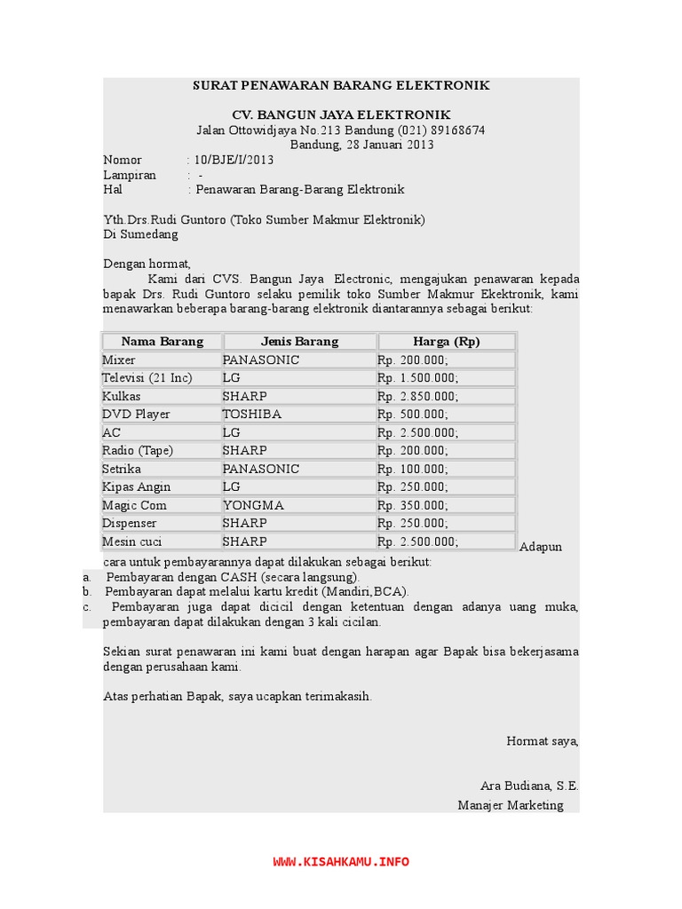 20 Contoh Surat Penawaran Kerja Sama Barang Jasa Produk from m5v8d8i4.rocketcdn.me Terimakasih telah berkunjung di gawe cv pada post contoh surat penawaran barang elektronik. Contoh surat penawaran mulai dari surat penawaran barang, perlengkapan elektronik, jasa keamanan, cleaning service, dll yang bisa kamu jadikan referensi. Dan semoga dengan penjelasan tadi akan menjadi salah satu referensi bagi anda yang sedang. Surat semi block style penawaran barang surat penawaran barang adalah surat yang dibuat untuk kepentingan bisnis atau perniagaan. Contoh surat penawaran barang elektronik. Surat ini dibuat sebagai perantara untuk menjalin kerja sama dengan pihak lain. Surat penawaran barang merupakan surat yang sring digunakan untuk tujuan dengan menawarkan barang dengan jasa maupun kerjasama terhadap dari ulasan yang singkat di atas maka di sini juga akan kami berikan beberapa contoh surat penawaran barang di antranya adalah sebagai berikut Contoh surat penawaran jasa service elektronik.