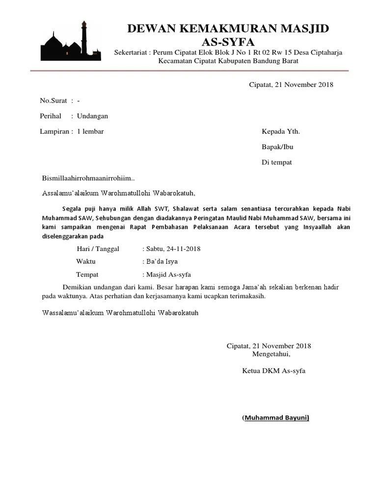 Sabtu malam minggu/ 20 oktober 2012. Himbauan untuk warga yang akan membuat ktp dan kia. Berikut adalah contoh surat undangan pembentukan pengurus masjid dan bisa juga diedit dan dipergunakan sebagai undangan dari pengurus masjid dalam kegiatan yang lain seperti phbi, rapat rutin, panitia zakat idul fitri dan kegiatan ramadan. Contoh surat undangan rapat karang taruna. Dengan mengetahui contoh surat undangan rapat,pastinya anda tidak akan kesusahan saat ingin mengumpulkan beberapa rekan kerja.