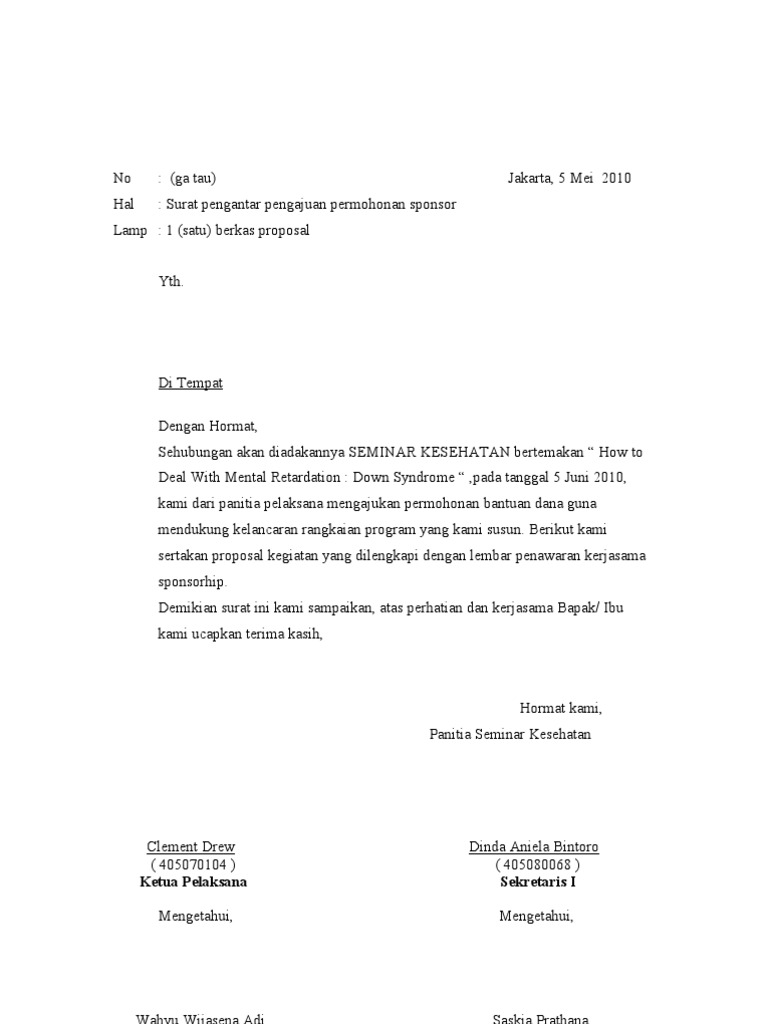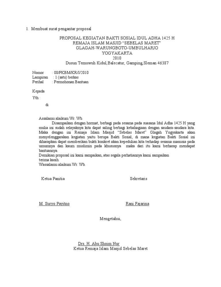 Dimana isi surat ini menginformasikan tujuan dari berkas yang akan diajukan. Surat pengantar proposal harus berada dalam posisi terpisah dari proposal kerja yang telah disiapkan para pengurus bumdesa. ( minta ke sekretaris umum ) : 1 (satu) berkas proposal : Karena pastinya, jika kita salah satu atau dua kata saja dalam.